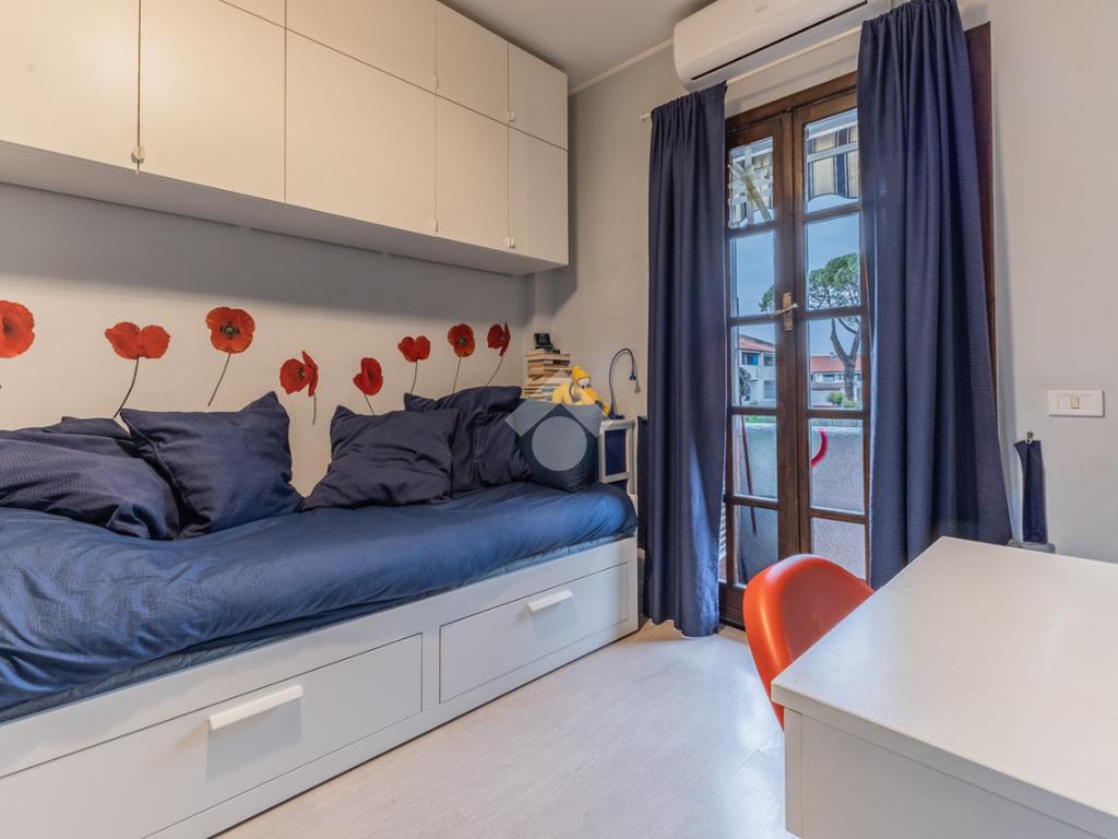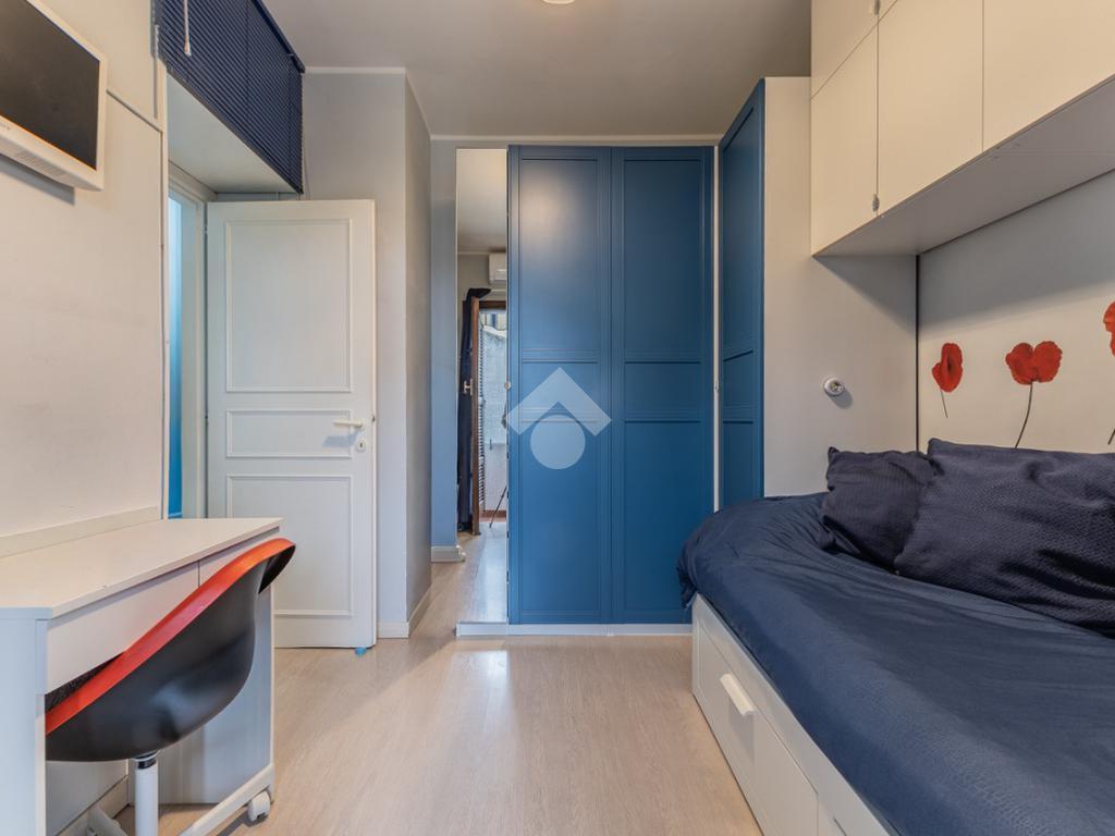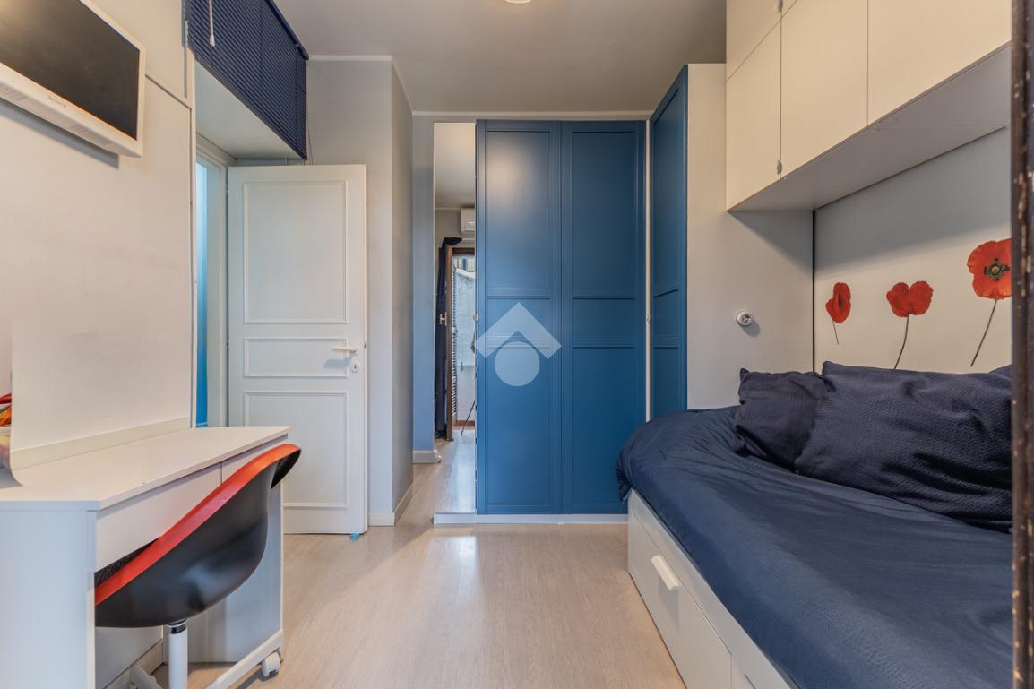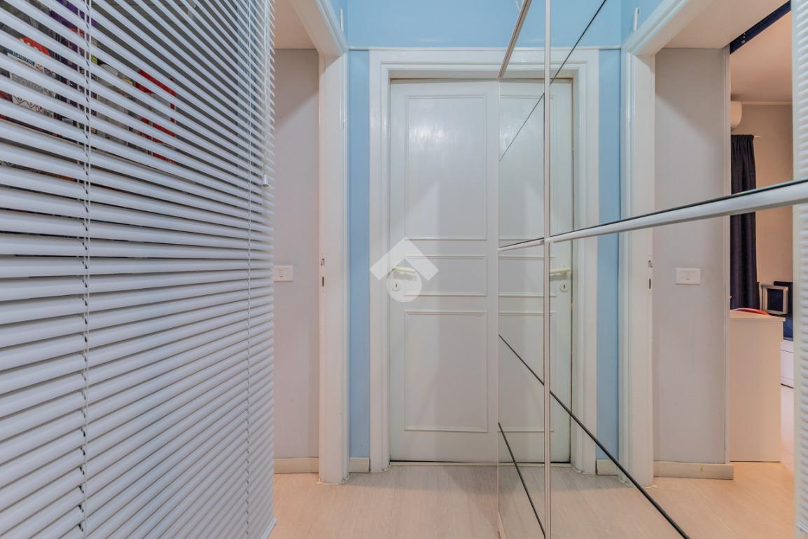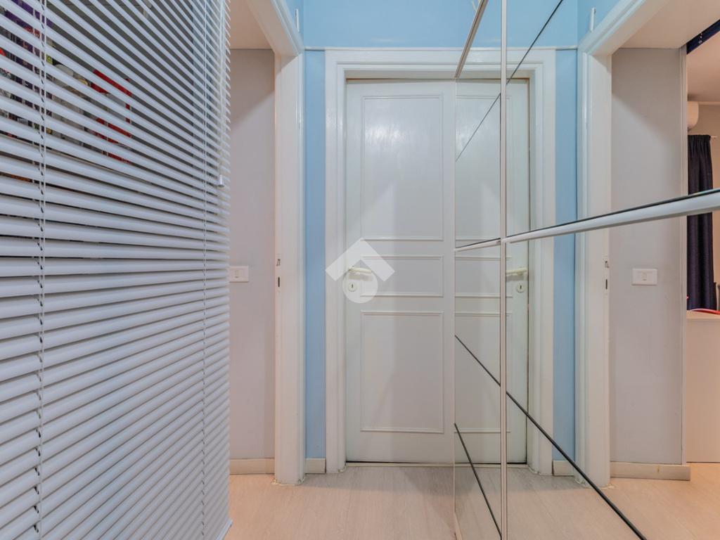 Proseguendo attraverso un disimpegno arricchito da pratici armadi a muro, si accede alla camera da letto matrimoniale con uscita sul balcone e al bagno finestrato dotato di doccia.